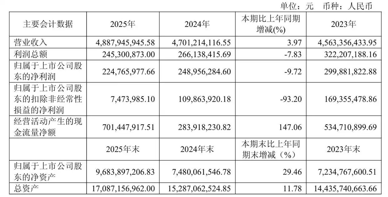 4月9日晚间,湘电股份(600416)发布2025年年度报告,公司全年实现营业收入48.88亿元配资世家网,同比上升3.97%;归母净利润同比下降9.72%至2.25亿元,连续两年下滑;扣非净利润仅剩747.4万元,同比大降93.2%。